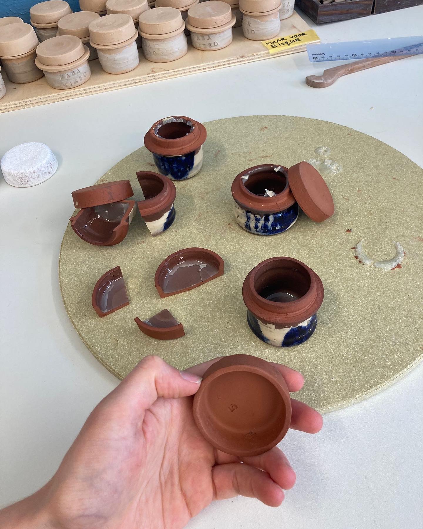 A project together with Arne HendriksIn the beginning of 2023 I got the assigment from Arne Hendriks to design & produce as many mini miesopots as possible (for the Dutch Design Week that October). At that time, I didn’t have a ceramic studio & experience in large scale production, but with a lot of help of a team (existing of friens and family) I managed to produce 900 mini miesopots on time! All pots are unique and have fitting lid. Arne Hendriks gives away these pots to people he has interesting conversations with during lectures, presentations, exhibitions or meetings. You want to be part of Buro Miso? Join one of the events with Arne Hendriks and you might just earn one of the 900.