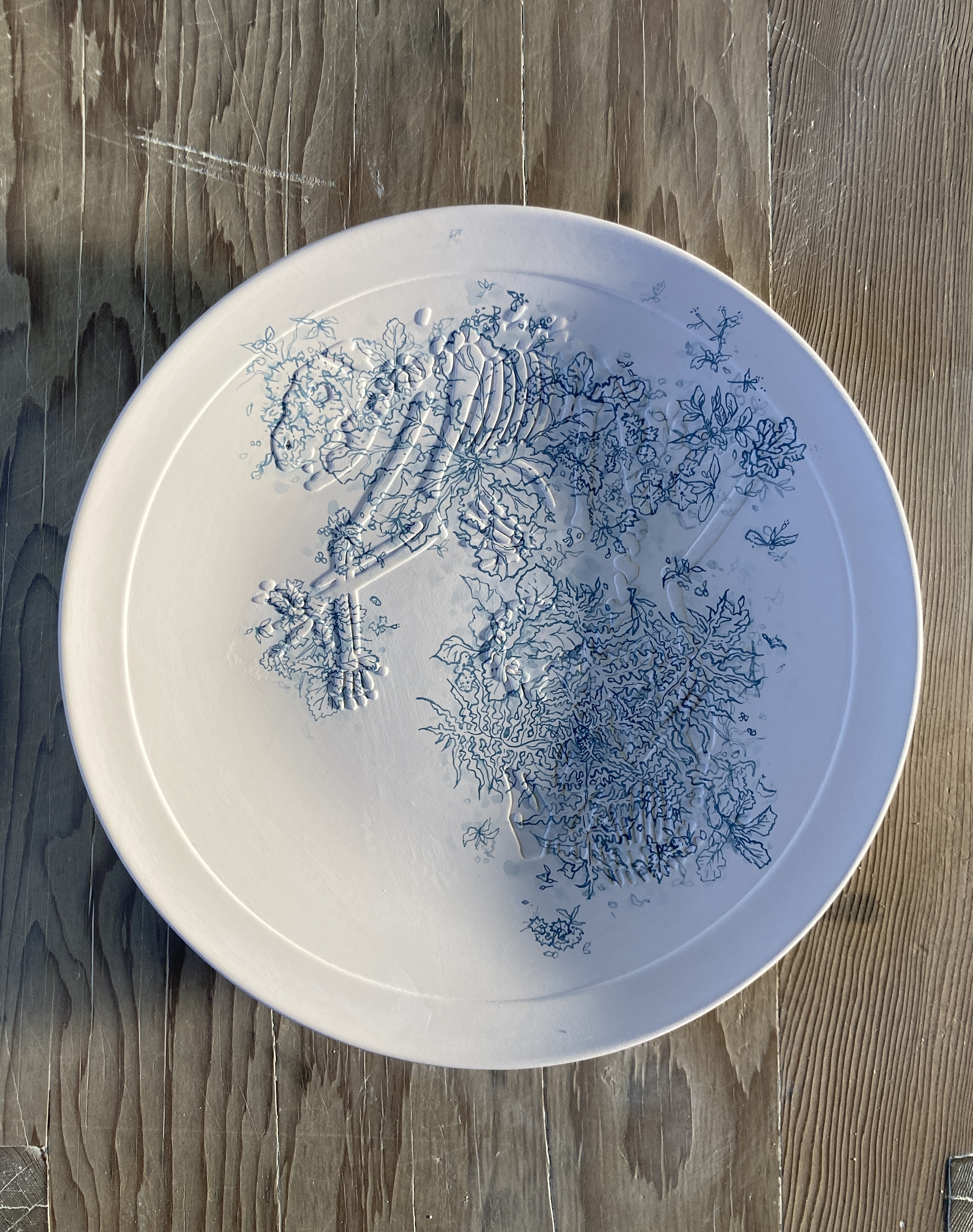 This layered design is an collaboration between the traditional technique of handpainting a cobalt blue illustration on top of a digitally shaped and carved plate. The combination of machine work an hand work makes this hidden illusion possible.