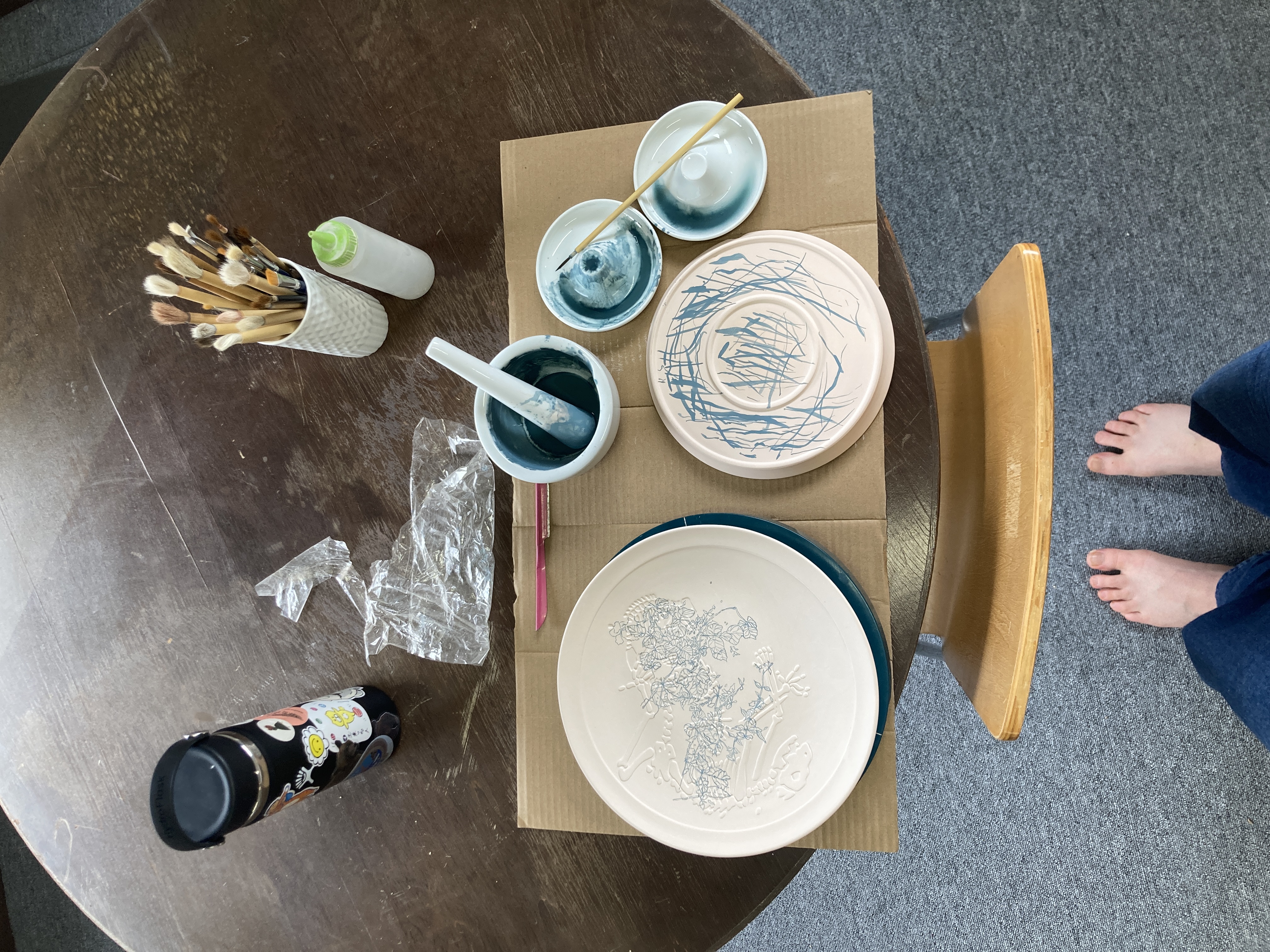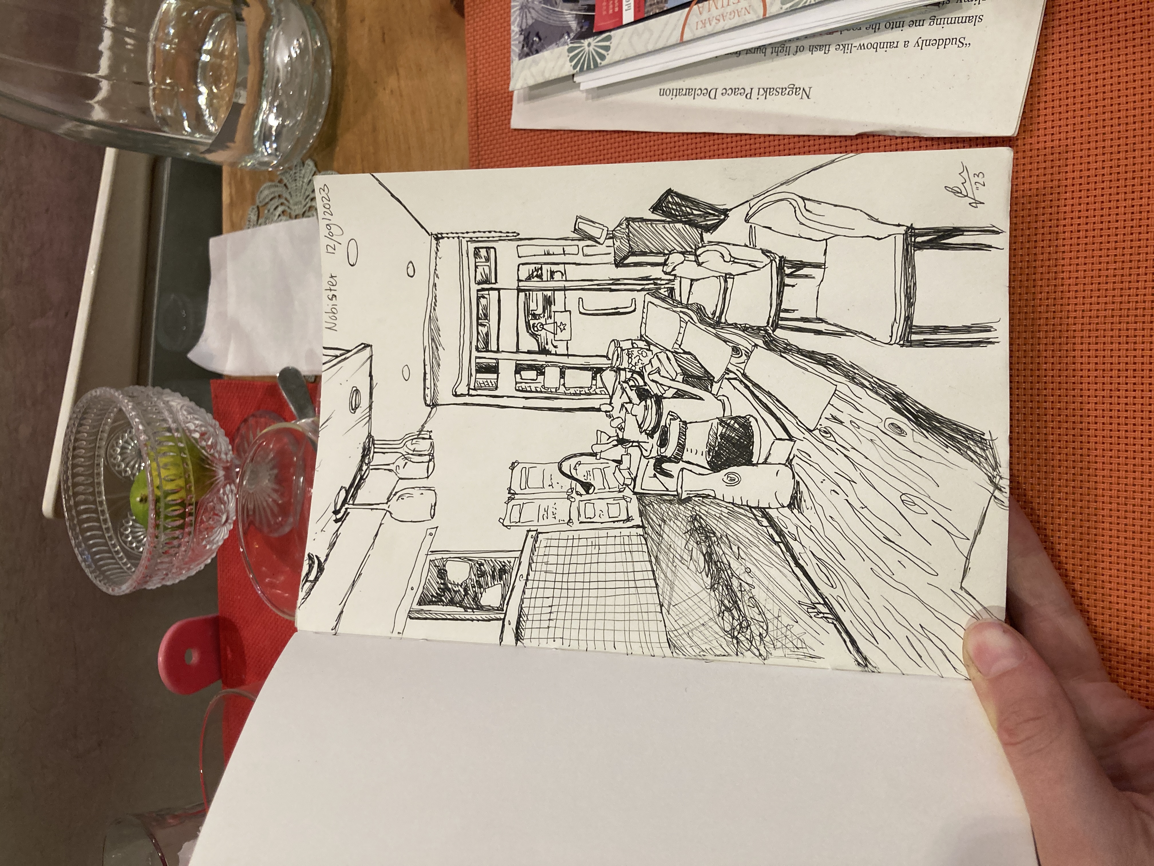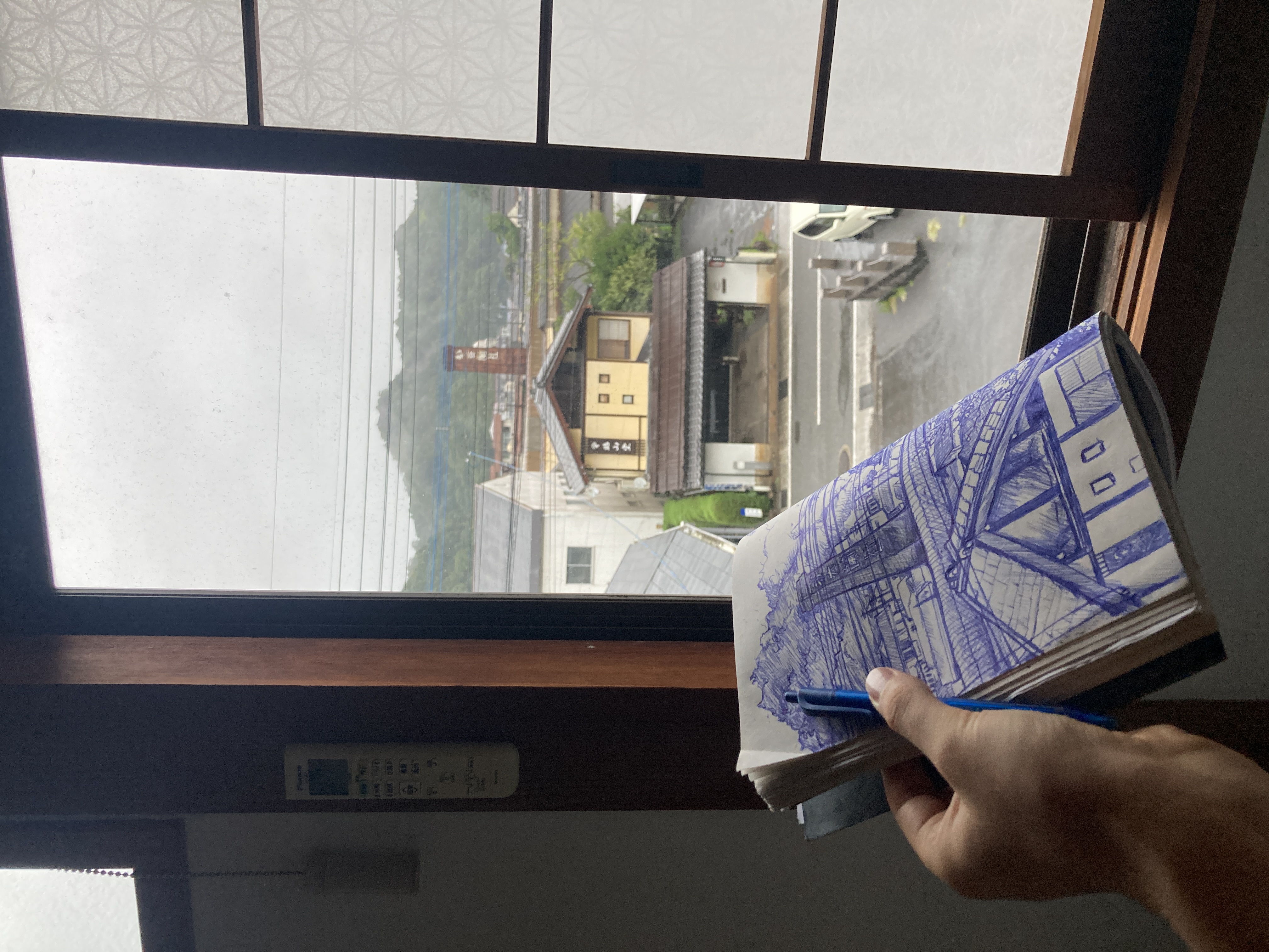 A very very thick journal full adventures & stories of my year travelling through Japan. On 24th of july 2023, I drew a map of Japan on the first page of my handmade journal. The red dots marked the destinations that I had in mind. Starting with the stay at the parents of a great friend of mine, in the north-western part of Japan. But that would just a pitstop before the "real" journey, that I had drawn carefully on this pencil drawing of Japan. During the course of 1 year, the notebook grew alongside me until it had the size and weight of a brick. It carries many of my worries, idea's, victories and doubts. The illustrations, photo's and to do lists describe Japan through my (often confused) eyes. This notebook has travelled from a island in the very south of Japan (Yakushima), to the very North (Hokkaido). It has seen farmland, ancient forrests, 1 person restaurant tables, igloo's, ceramic workspaces, Temples and a red wooden castle. The books became a tool to meet new friends. Those were the people who told me to publish my brick. So, here I am, currently working to edit and maybe someday publish the illustrated book that guided me through Japan.